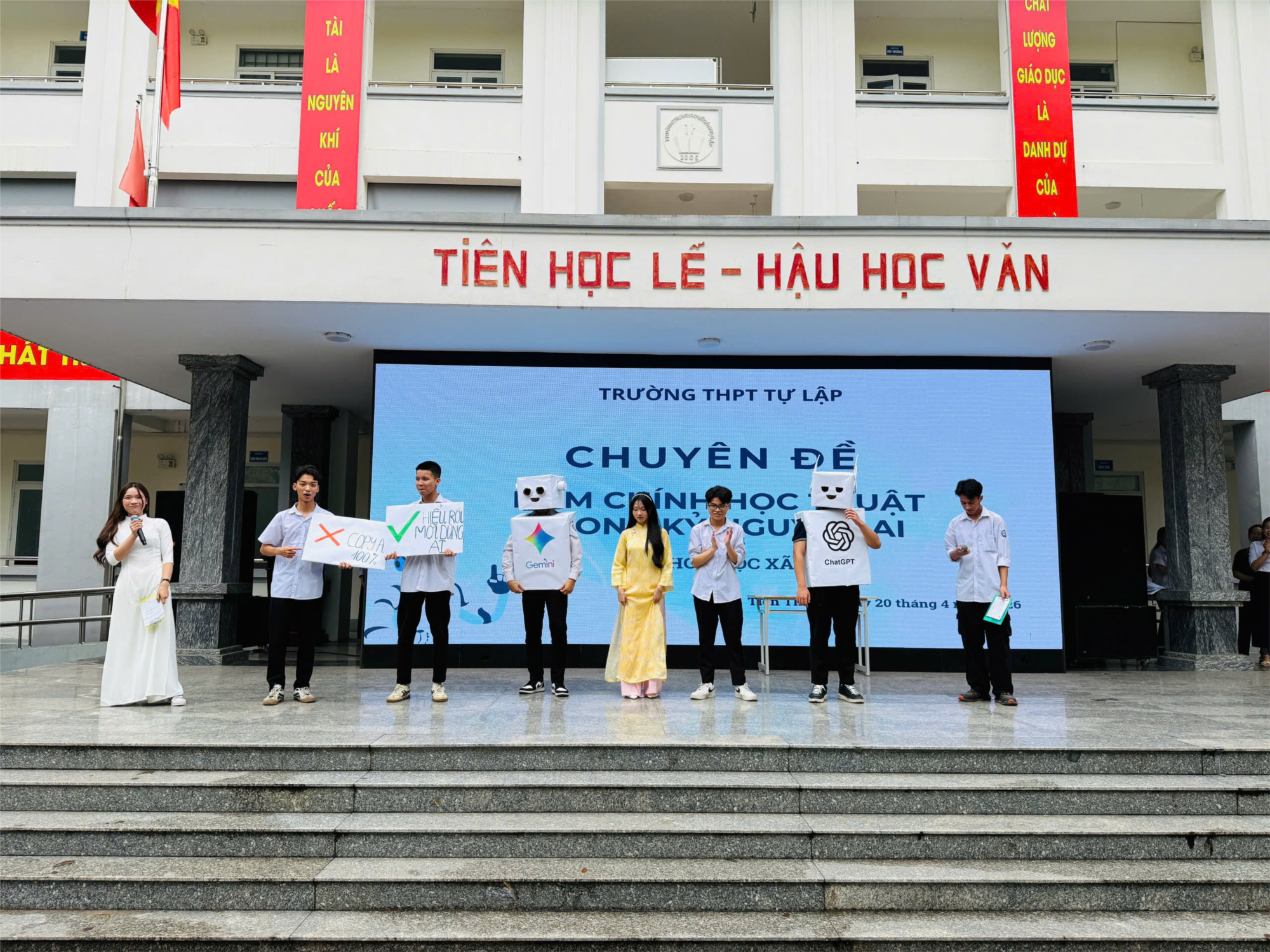 Thông qua phần khởi động nhận diện các ứng dụng AI quen thuộc như ChatGPT, Google Gemini, cùng video khảo sát thực tế từ chính học sinh nhà trường, chuyên đề đã phản ánh rõ thực trạng: AI đang được sử dụng ngày càng phổ biến, nhưng không ít học sinh còn có thói quen chép lại kết quả, thiếu kiểm chứng hoặc sử dụng AI khi gặp áp lực học tập.