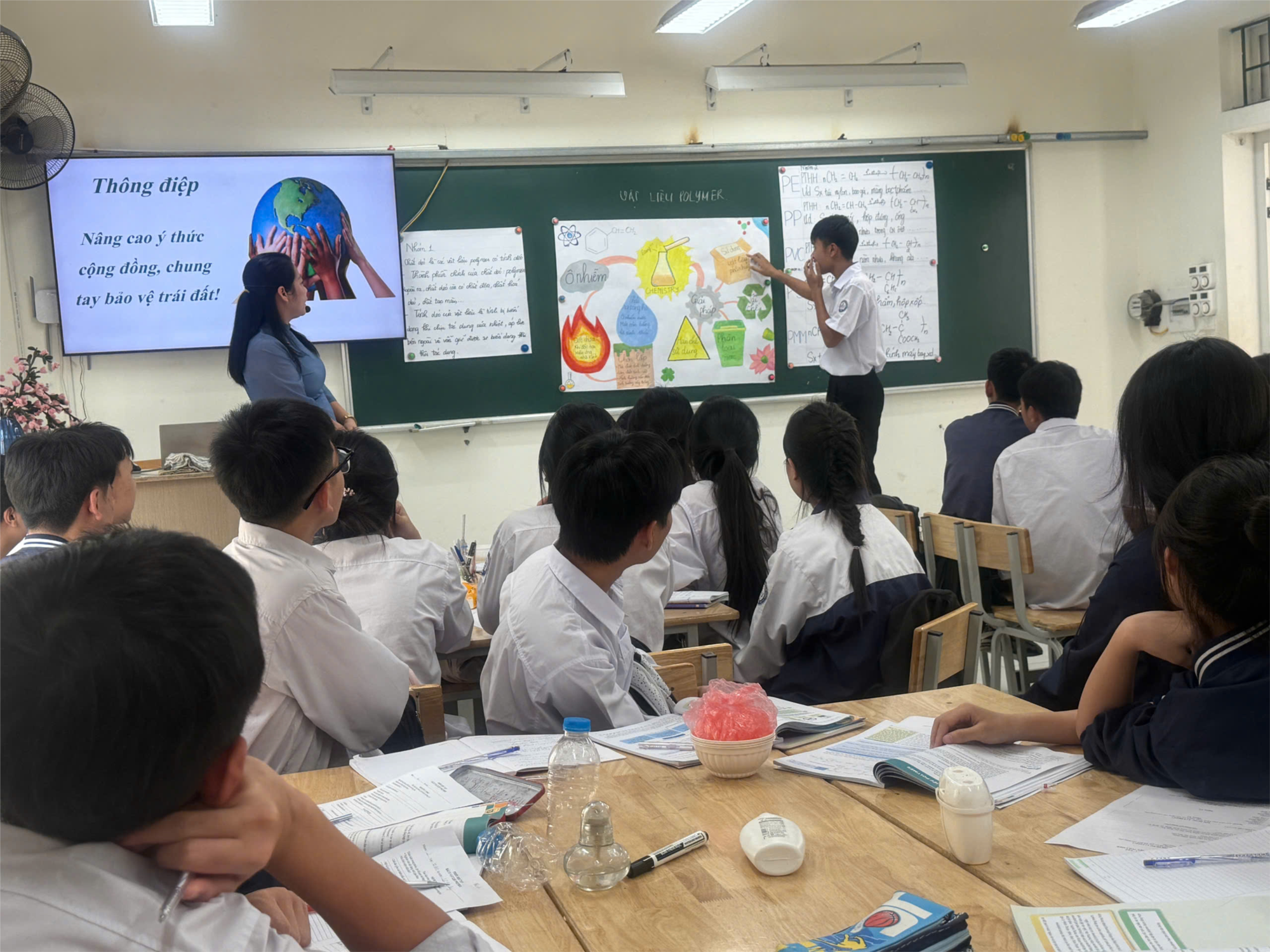 - Cô Nguyễn Thị Như Quỳnh (Hóa, tiết “Vật liệu Polymer”) tổ chức thí nghiệm và giải thích lý thuyết về polymer, giúp học sinh hiểu cấu trúc, tính chất và ứng dụng thực tế của polymer trong nhựa, cao su, y tế… đồng thời khơi gợi trách nhiệm về bảo vệ môi trường qua tái chế
