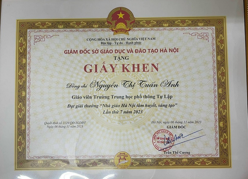 Ngày 09/11/2023 Cô giáo Nguyễn Thị Tuấn Anh - TTCM tổ khoa học xã hội - Trường THPT Tự Lập - Mê Linh - Hà Nội đã vinh dự là một trong số nhà giáo cấp học trung học phổ thông được vinh danh Giải thưởng Nhà giáo Hà Nội tâm huyết sáng tạo lần thứ 7.